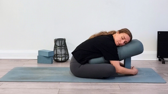 Practices are mostly floor-based and supported with blankets and bolsters, with longer periods of stillness, guided relaxation, and elements of self-care.