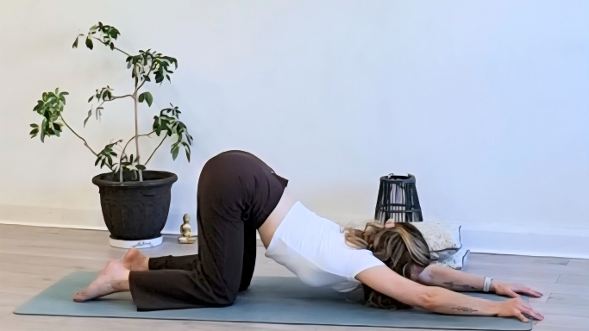 Practices are mostly floor-based and supported with blankets and bolsters, with longer periods of stillness, guided relaxation, and elements of self-care.